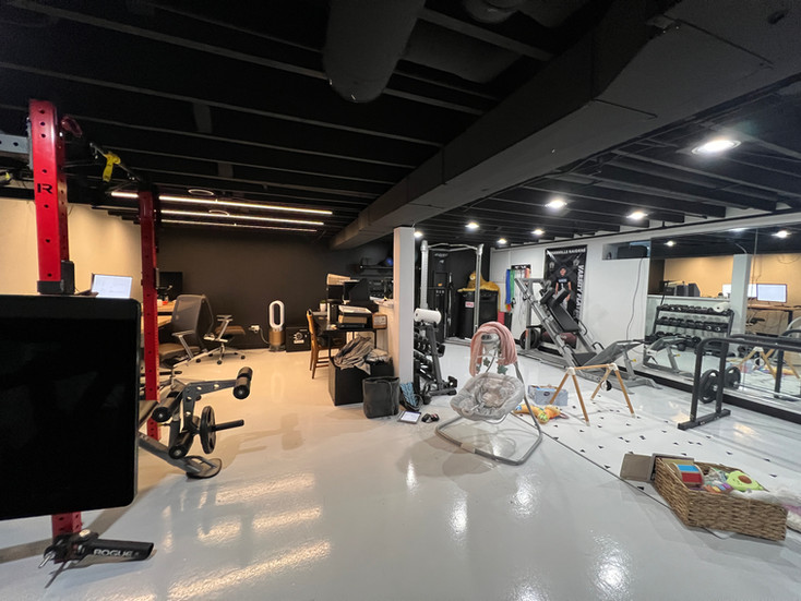 The existing half-height wall separating the gym and office was extended to full height. This created a clear division between spaces and gave the husband the professional Zoom backdrop he needed. The addition of LED lighting under the shelves added a warm, inviting ambiance—easily my favorite feature of the design!