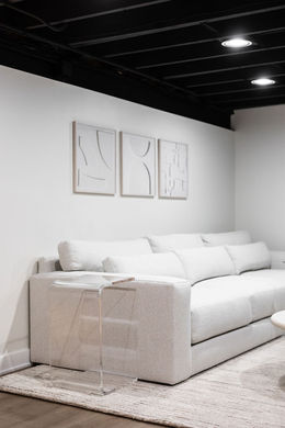 A basement space that once served as a workout area and home office was transformed into a versatile lounge and a peaceful, productive home office.
